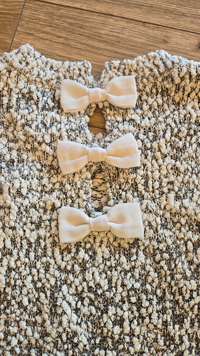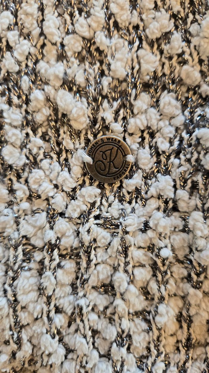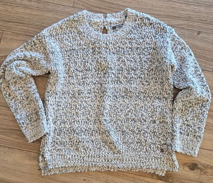 Pull de chiné noir et blanc avec des fils dorés. Dans le dos une série de 3 nœuds blancs. Pull idéal pour l’intersaison. De la marque Kaporal en taille XS en très bon état général.