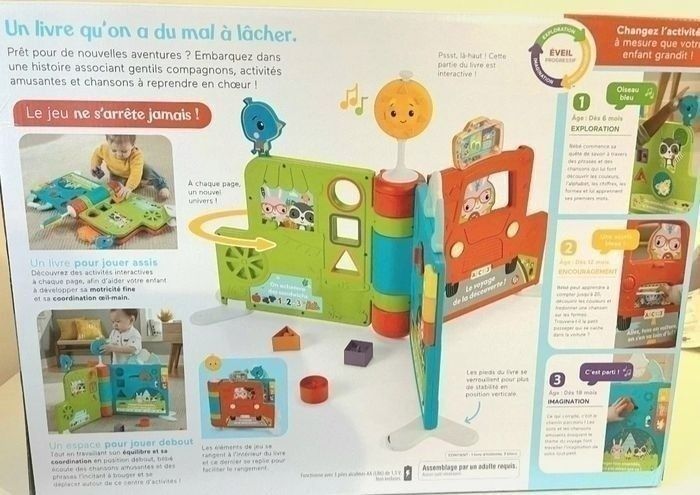 Neuf, emballage scellé Jouet d’éveil électronique 2 en 1 qui se transforme de grand livre à explorer assis à centre d’activités à explorer debout, avec une zone de jeu à 360 degrés Trois niveaux de contenu éducatif Éveil Progressif pour découvrir l’alphabet, les chiffres, les formes et les couleurs, apprendre à compter et ainsi favoriser une alphabétisation précoce 3 pages d’histoire et 8 activités amusantes, dont 3 formes à trier, une roue, un élément coulissant, une porte « coucou » et plus encore 3 boutons lumineux pour activer plus de 120 chansons, sons, mélodies et phrases Pour tout-petits, de 6 mois à 3 ans #electronique #apprentissage #educatif
