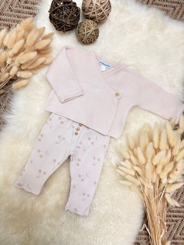 Brassière en maille rose pale, Vertbaudet Legging côtelé, motifs cerises, Kiabi 3 mois Très bon état
