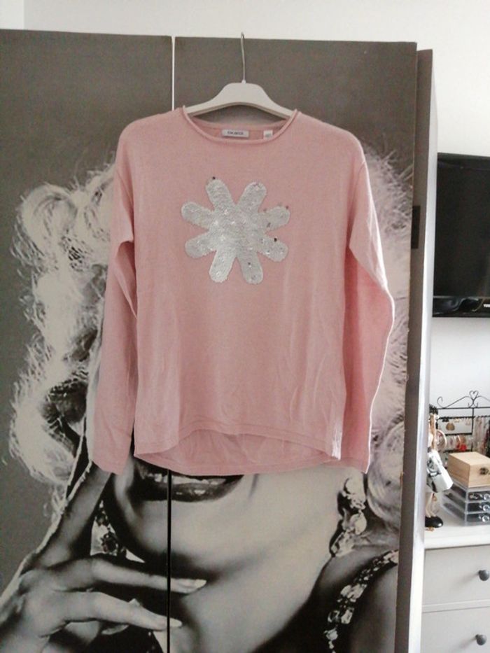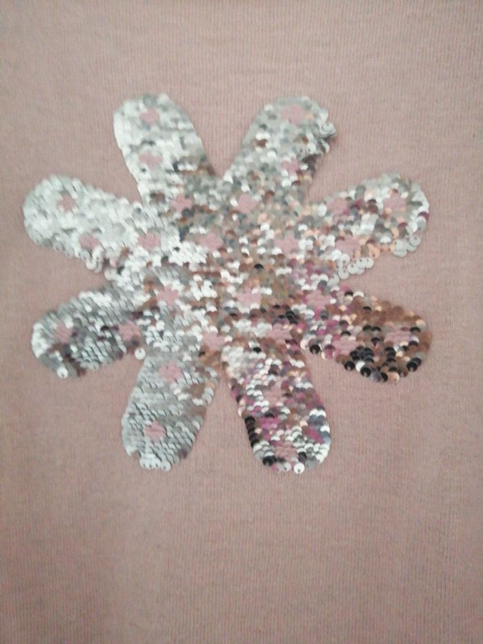 Pull col rond Dessin d une fleur tout en sequin avec la possibilité de faire apparaître des petites fleurs roses à l'intérieur On ne le voit pas sur les photos mais le pull à plein de brillant 12 ans (152cm)