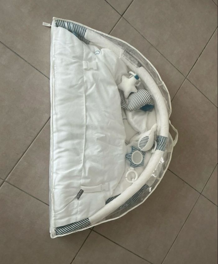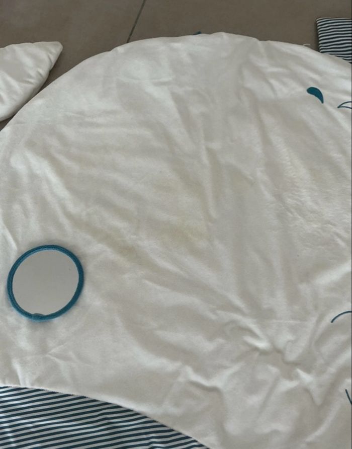 Joli tapis d’éveil bébé motif baleine avec arche, petits jouets suspendus, miroir et housse de rangement. Très doux et agréable pour les temps d’éveil et de jeu de bébé. Les couleurs blanc et bleu sont apaisantes, et les accessoires permettent de stimuler la curiosité de bébé dès les premiers mois. À noter : une légère décoloration / jaunissement est visible sur le tapis sur les photos, ce qui explique le prix, mais l’ensemble reste en bon état et parfaitement utilisable. Maison non-fumeur. Envoi rapide et soigné.