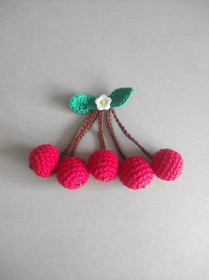 Dinette pour jouer à la marchande. Une grappe de 5 cerises Réalisé au crochet