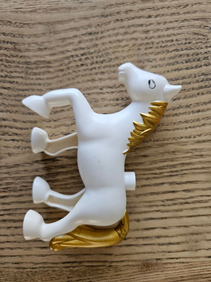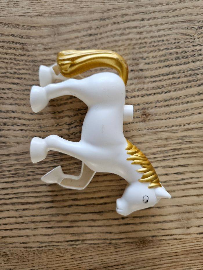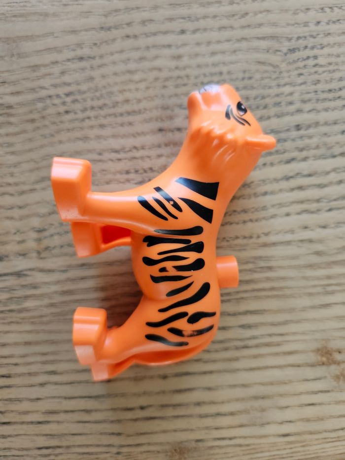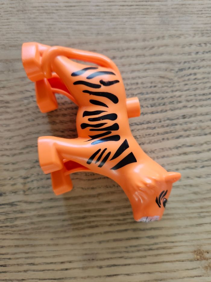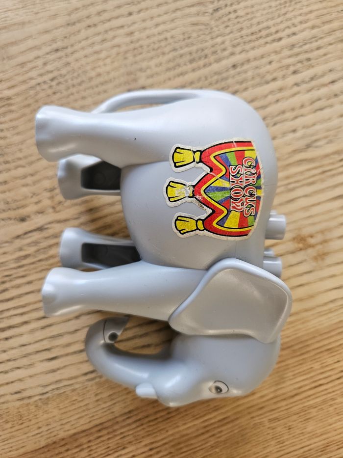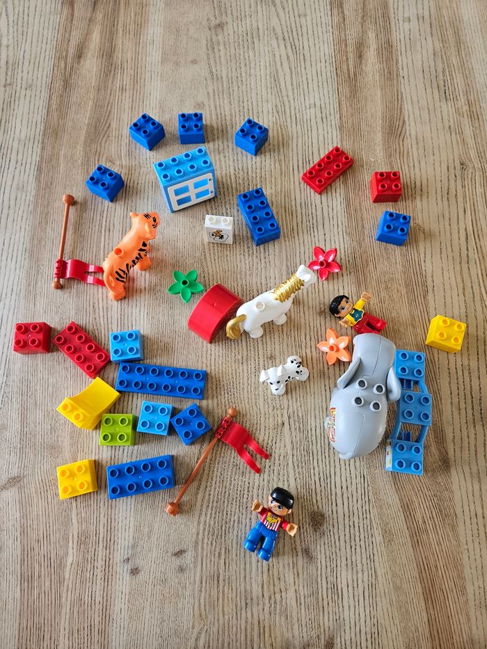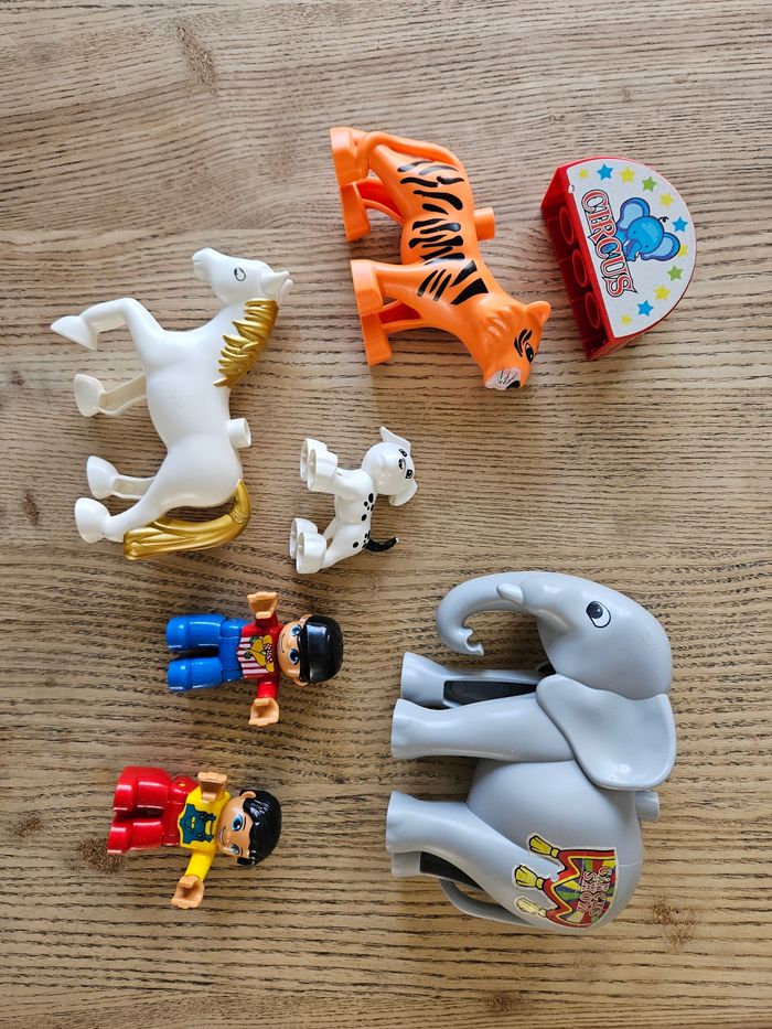 Composé de 32 élèments sur le thème du cirque (animaux, drapeaux...). Les autocollants de l'élèphant portent des traces d'usure normales et les yeux du cheval sont un peu plus clairs que neuf. Je n'ai plus le carton d'origine, les légos seront envoyés dans un autre carton et bien protégés. Très bon état.