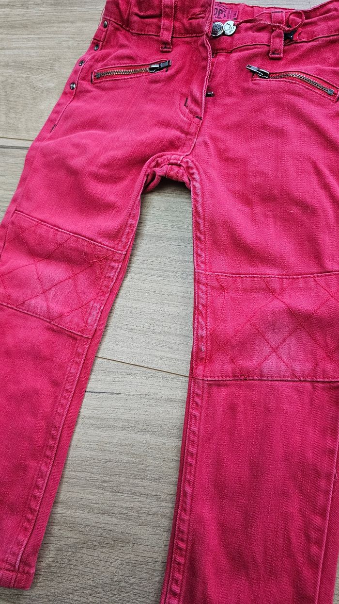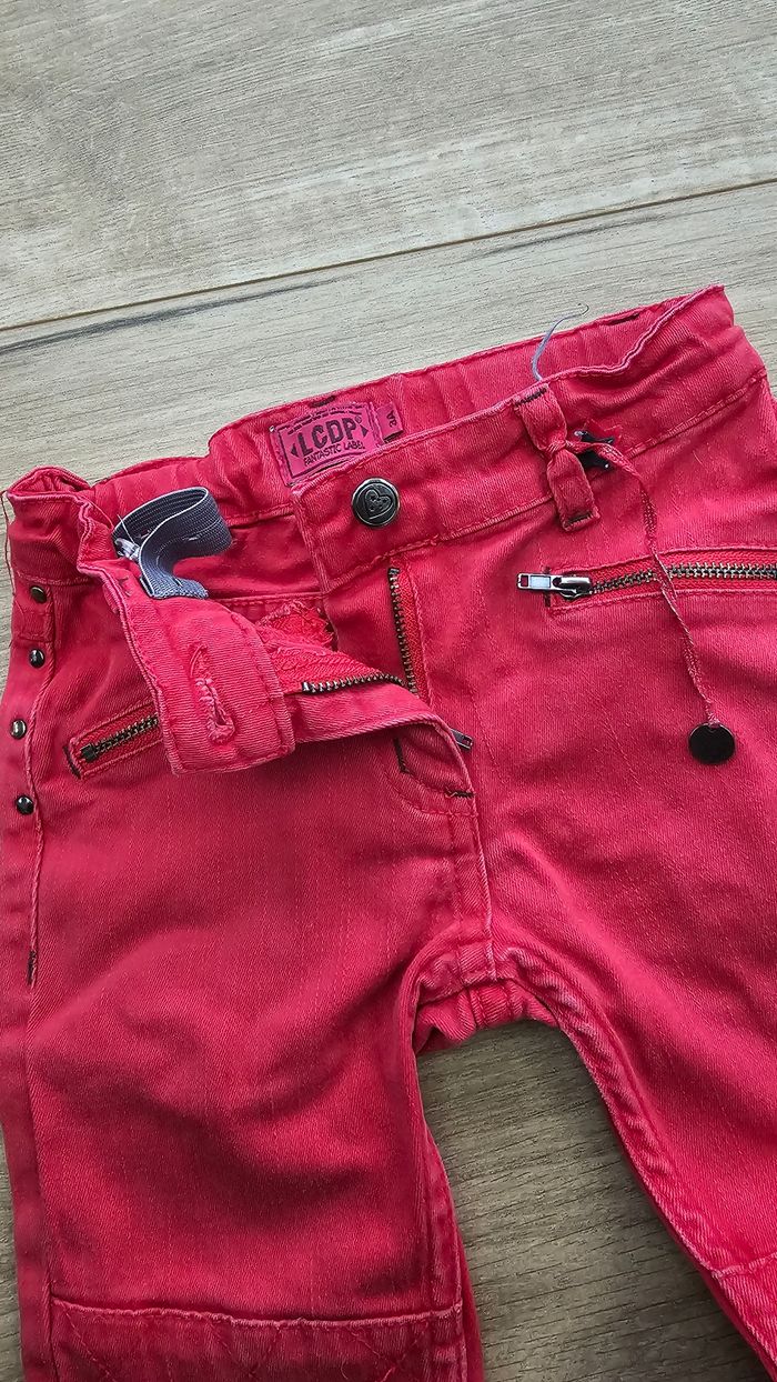 Pantalon 👖 pour fille 👧🏽 en jeans 🎨 Rouge 📍 Poches zippées devant ⚠️ Un peu décoloré sur les genoux. 📏 3ans #harmonie1017fille3ans
