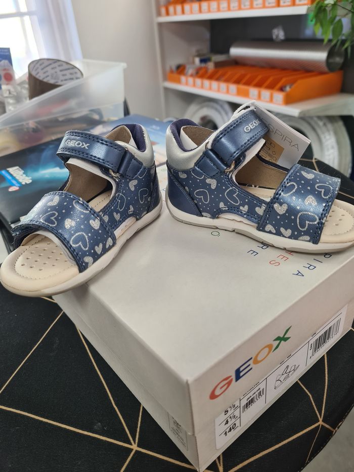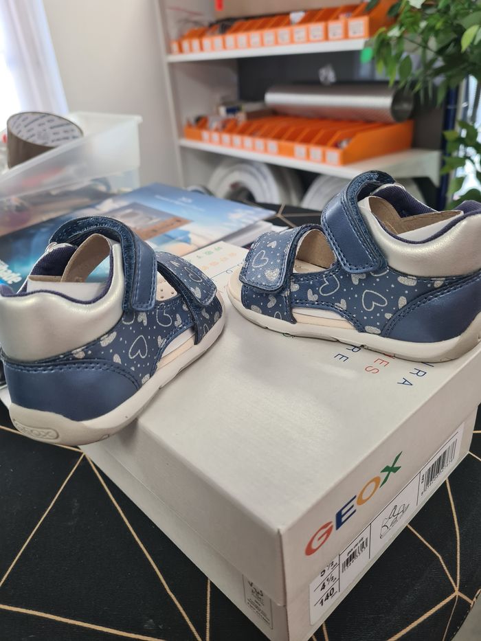 Je vends cette paire de sandales Geox pour enfant. Confortables et légères, elles sont parfaites pour l'été et les balades en famille. - Type de produit : Sandales - Univers : Enfant - Marque : Geox - Pointure : 21 - Couleur : Bleu ciel et blanc - Motif : Cœurs et étoiles - Fermeture : Scratch - Accessoires inclus : Boîte d'origine N'hésitez pas à me contacter si vous avez des questions !
