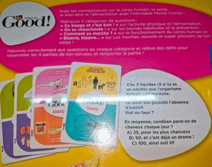 Teste tes connaissances sur le corps humain, la santé, le bien être et l'alimentation de manière ludique et fun grâce au nouveau jeu familial pensé par le fameux Dr. Good, Michel Cymès. Retrouve 4 catégories de questions: << Ça bouge et c'est bon ! >>> sur l'activité physique et l'alimentation, << On se chouchoute ! >>> sur les bonnes habitudes et la prévention, << Comment ça marche ? >> sur le fonctionnement du corps humain et << Bizarre, bizarre... >> sur les insolites, records et super pouvoirs de ton corps! Réponds correctement aux questions et relève des défis pour rassembler les 4 parties de ton cerveau et gagner la partie! En plus, chaque réponse a son explication. Contenu de la boîte: 1 plateau, 6 pions, 1 dé, 24 quarts de cerveaux, 220 cartes, 1 règle du jeu. Sous blister 2 à 6 joueurs +8 ans Durée une vingtaine de minutes