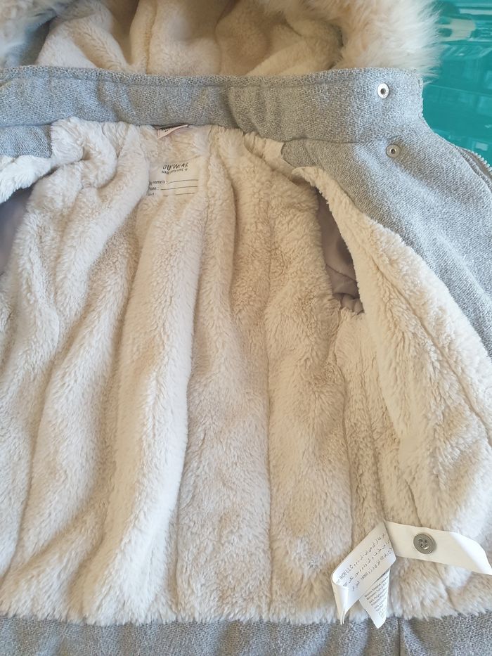 Manteau très chaud polaire à l'intérieur. Pour fille 4 ans. Marque tape à l'œil. Tres peu porté pas de bouton manquant fermeture éclair fonctionne très bien. Couleur gris légèrement pailleté