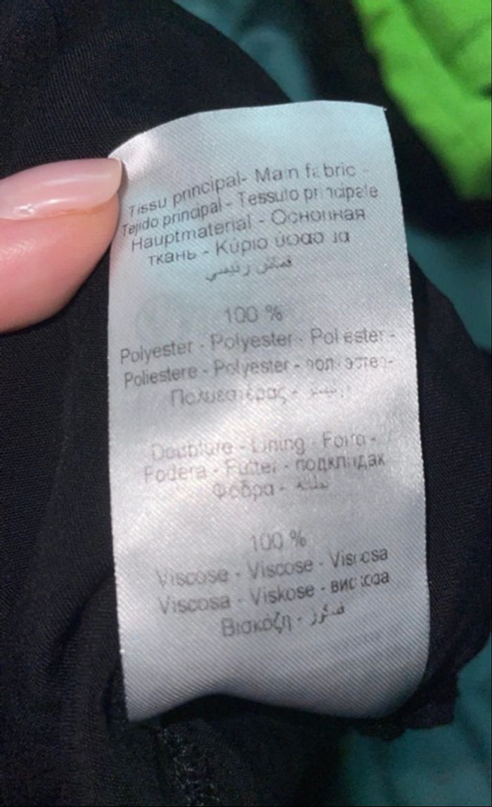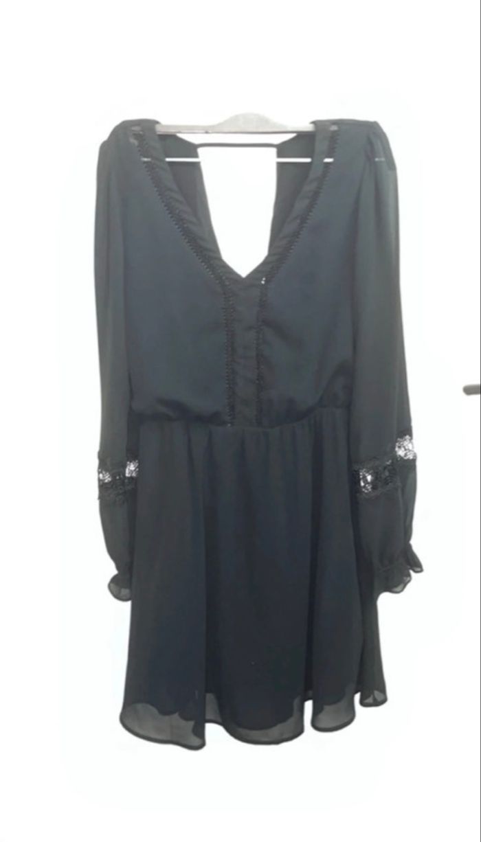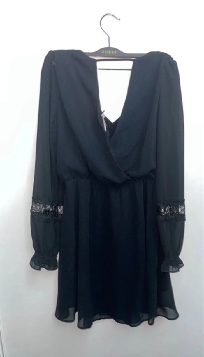 > Je vends cette robe courte Naf Naf achetée il y a environ un an. > * Pourquoi je m'en sépare : Je fais un grand tri dans mon dressing car je ne la porte plus assez. > * État : Portée quelques fois mais encore en super état. Pas de défaut particulier à signaler, les détails en dentelle sur les manches sont impeccables. > * Coupe/Taille : C'est une taille 36. Elle possède une taille élastiquée qui marque bien la silhouette et un joli décolleté en V (croisé style cache-cœur). La doublure est en 100% viscose, ce qui la rend très confortable à porter. > * Détails : Manches longues légèrement transparentes avec empiècement dentelle et poignets élastiqués. Dos ouvert avec bride de maintien. > #nafnaf #