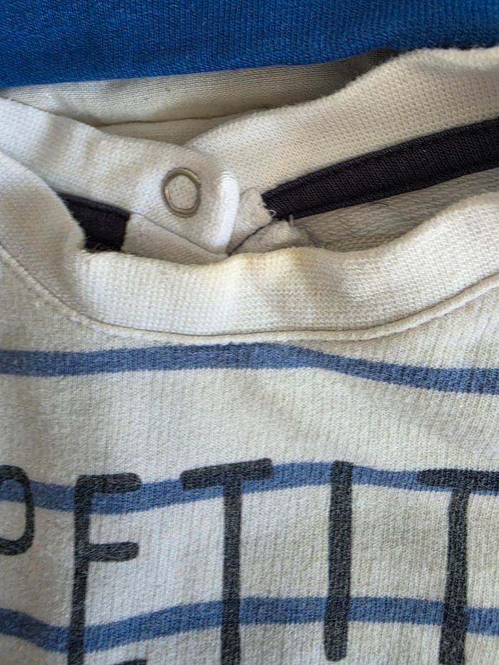 Lot de 3 pulls taille 3 mois Un pull bleu little bro (petit frère) marque charanga Un pull marinière petit bolide de la marque brioche (legere tache au niveau du col) Un pull avec joli détails marque DPAM