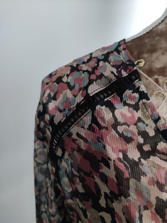 Jolie chemisier multicolore avec son top noir. Bretelles réglables. Bas élastique. Motifs sur les épaules et les manches. Noeud devant.