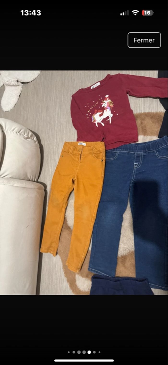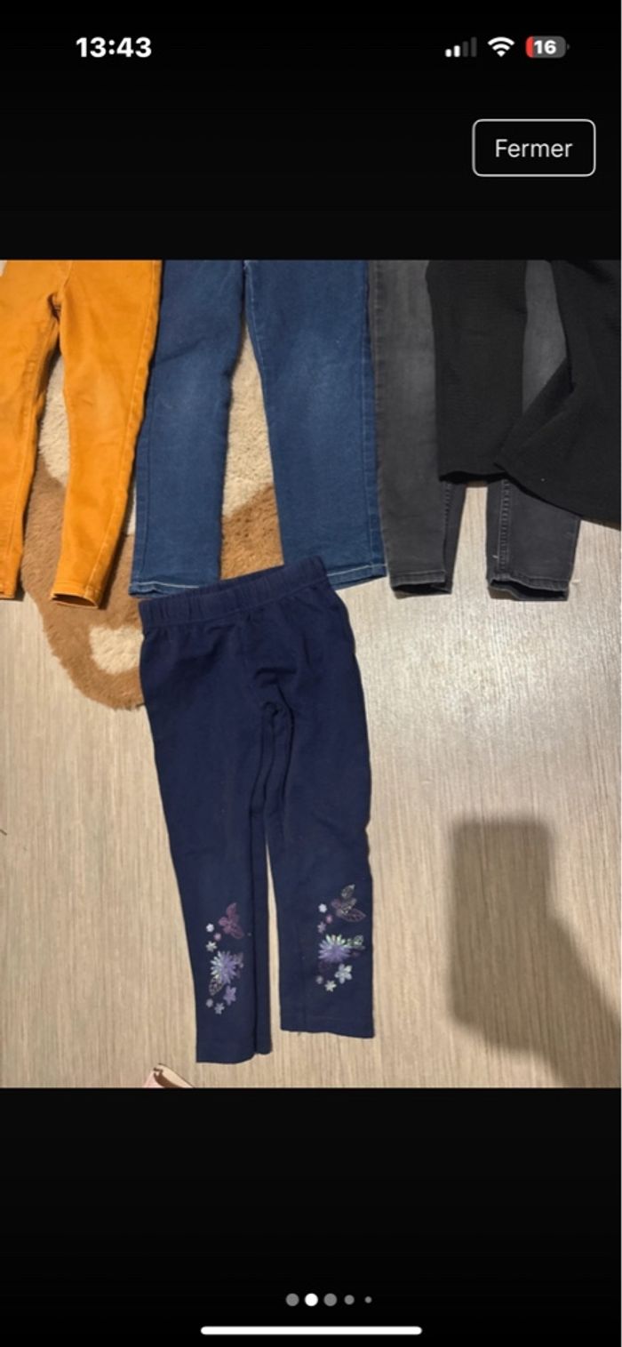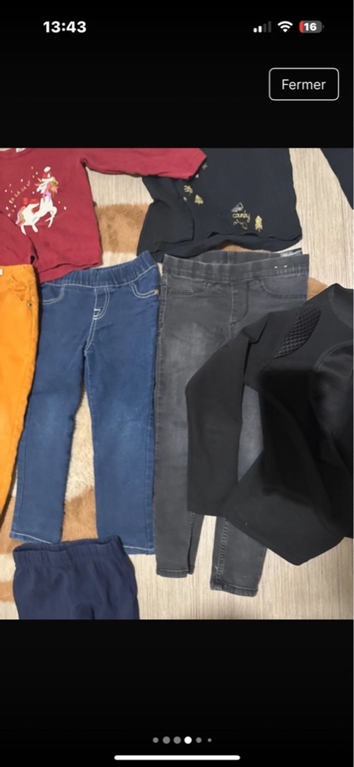 Pantalon leggins jeans bleu brut 4 ans TEE shirt kiabi manche longue 4 ans Pull licorne bordeau 104 cm Leggins fleurie bleu marine 4 ans Pantalon jeans moutarde gemo 3 ans mais taille 4 ans Pantalon leggins jeans gris 4 ans Gilet noir pas de taille mais 4 ans