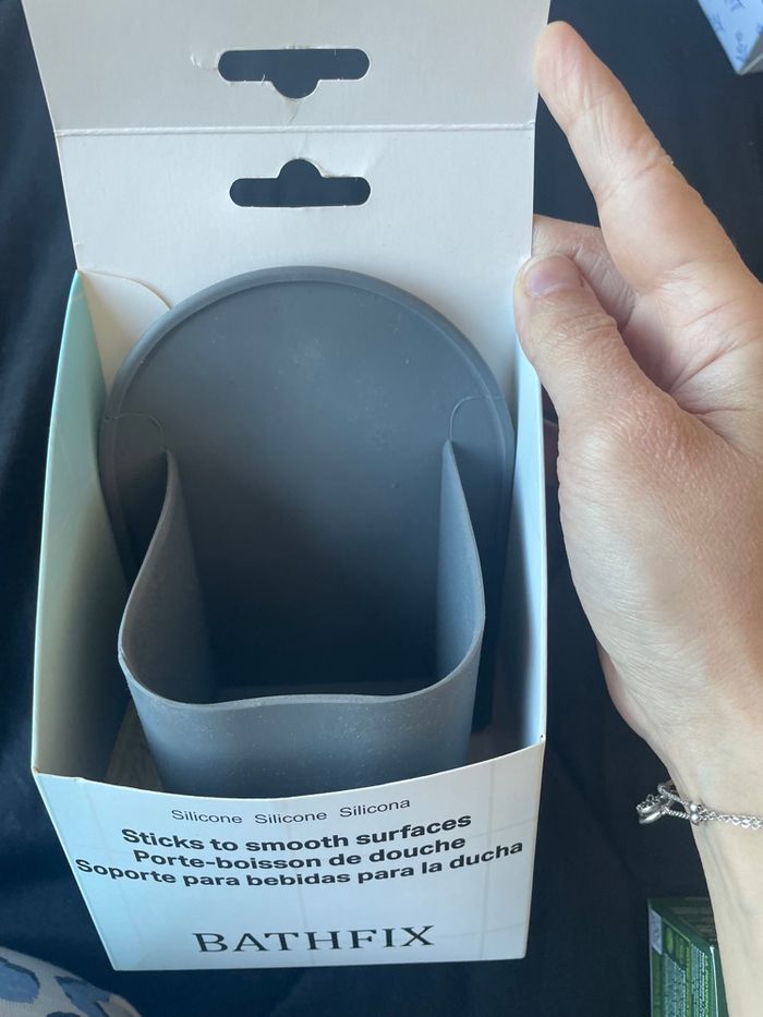 porte-canette / porte-verre pour la douche • Matière : silicone • Fixation : adhère directement sur les surfaces lisses (carrelage, verre, miroir…) • Utilité : garder une boisson (canette, bouteille, verre) à portée de main pendant la douche • Caractéristiques : • résistant à l’eau et à l’humidité • amovible et repositionnable • parfois avec petits trous pour évacuer l’eau • Concept : accessoire fun pour se détendre sous la douche (souvent utilisé pour boissons fraîches)