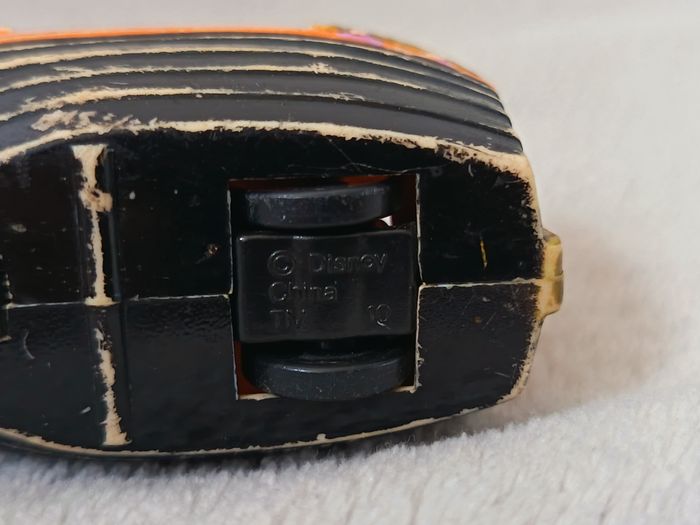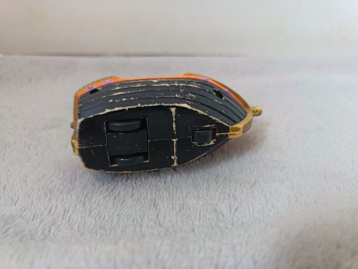 Figurine vintage Disney : Le Capitaine Crochet sur son navire Plongez dans l'univers de Peter Pan avec ce petit bateau pirate transportant le célèbre Capitaine Crochet. Un objet idéal pour les collectionneurs de l'univers Disney ou pour compléter un set de jeu vintage. Marque : Authentique Disney (inscription "© Disney China" sous la base). Dimensions : Mesure environ 9 cm de long. Fonctionnalité : Équipé de petites roues en dessous pour pouvoir rouler. État : État d'usage / Vintage. Comme on peut le voir sur les photos, la peinture noire de la coque présente des manques et des traces d'usure dues au temps (effet "vieilli" naturel pour un jouet de cet âge). La figurine de Crochet est encore bien colorée