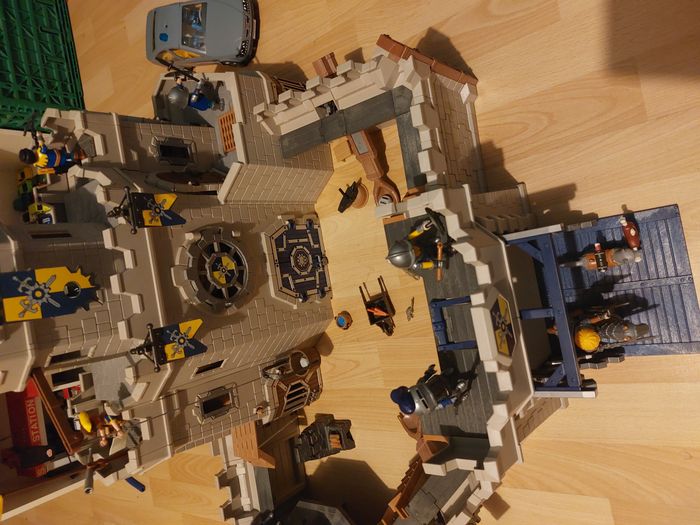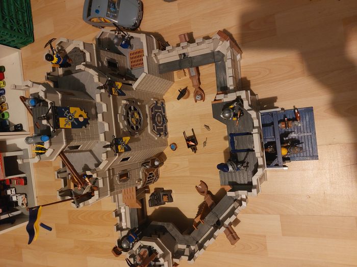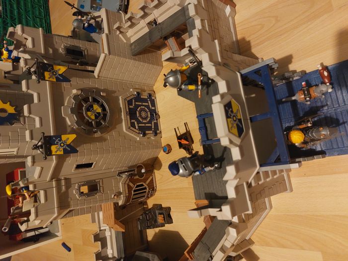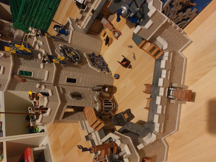 PLAYMOBIL 70220 Grand château des Chevaliers Novelmore en très bon état sauf un pied de brouette cassée et le mur cassé qui a du mal à tenir voir photo j ai entouré et il y a 7 personnages en plus qu'on a acheter en plus.