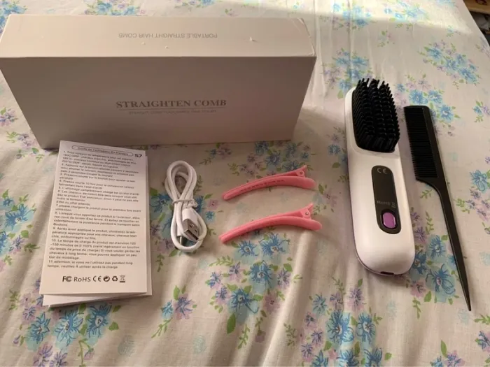 Je vends cette brosse à lisser électrique, un accessoire pratique et efficace pour obtenir des cheveux lisses et brillants au quotidien. - Type de produit : Brosse à lisser électrique - Univers : Femme - Couleur : Blanc - Fonctionnalités : Technologie ionique, Température réglable, Cordon USB - Accessoires inclus : Boîte d'origine, Notice d'utilisation, Câble USB, 1 peigne, 2 pinces Neuf avec étiquette N'hésitez pas à me contacter pour plus d'informations.