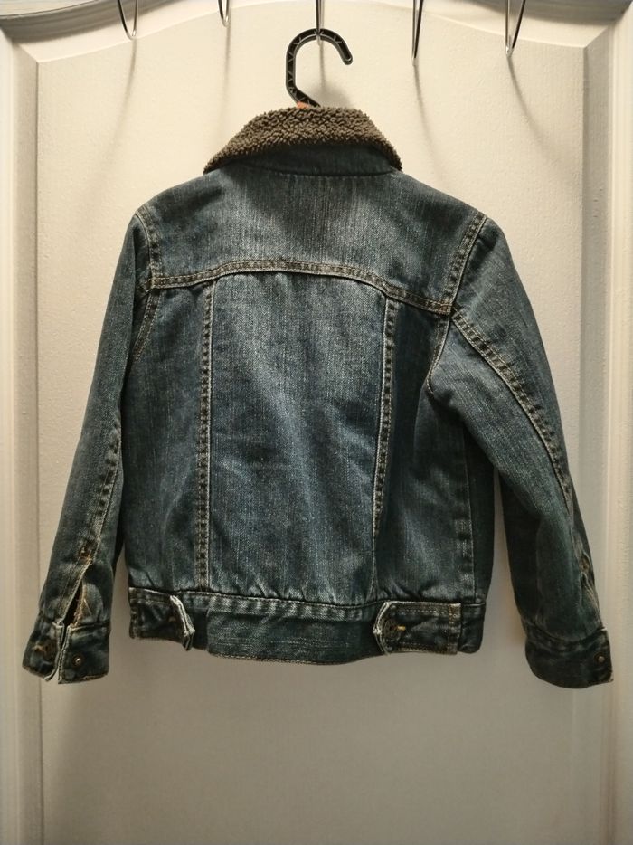 Bonjour, je vends une veste en jeans, mi saison, col fourré, intérieur synthétique, en bon état, en 4 ans
