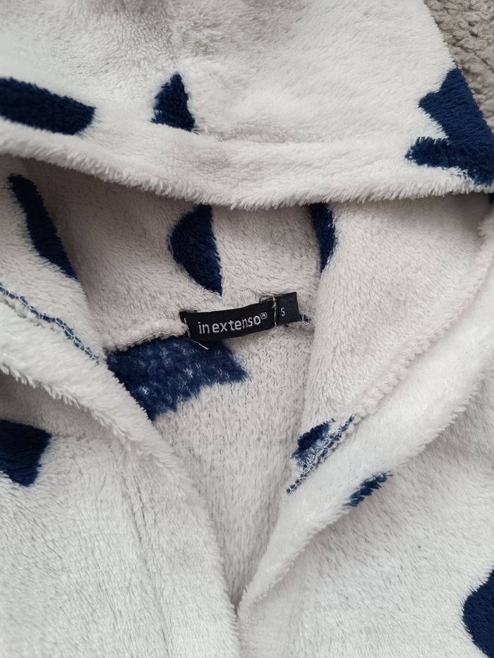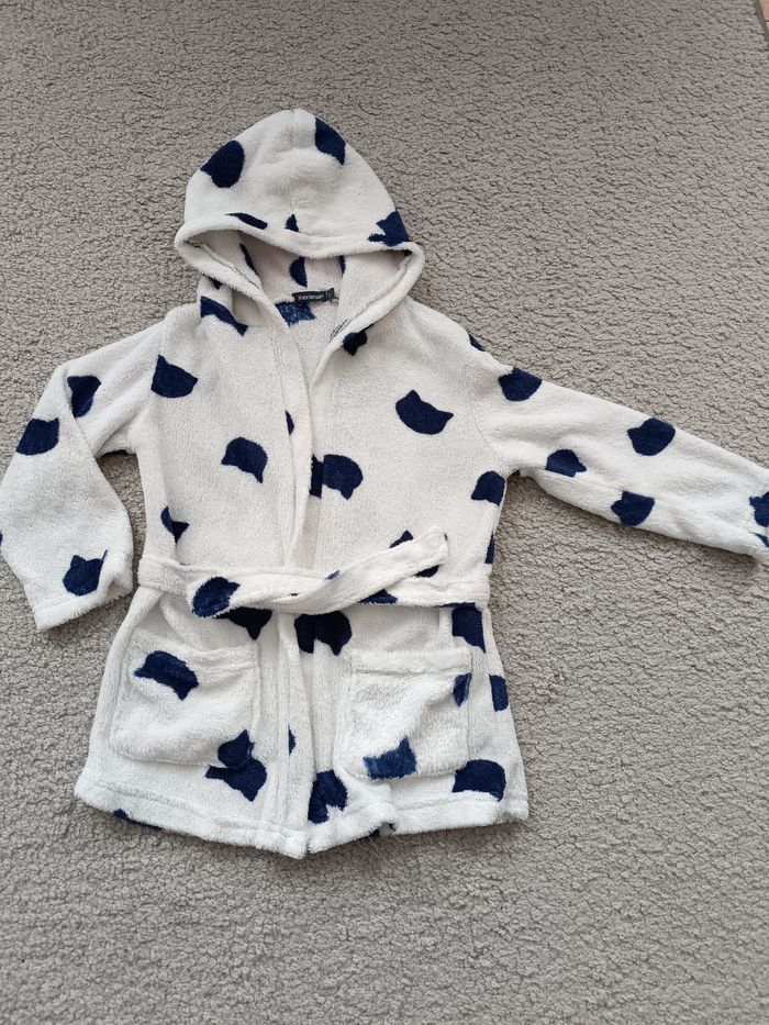 Robe de chambre blanc avec motif tête de chat bleu marine in extenso taille 5 ans matière douce