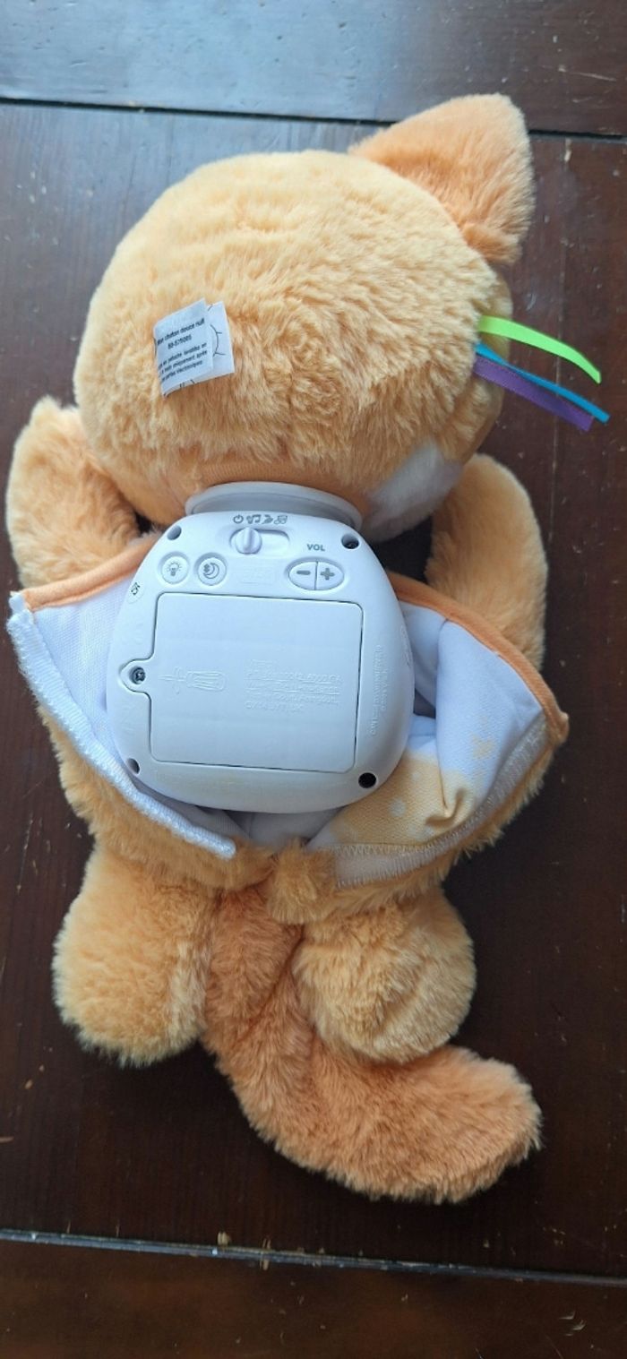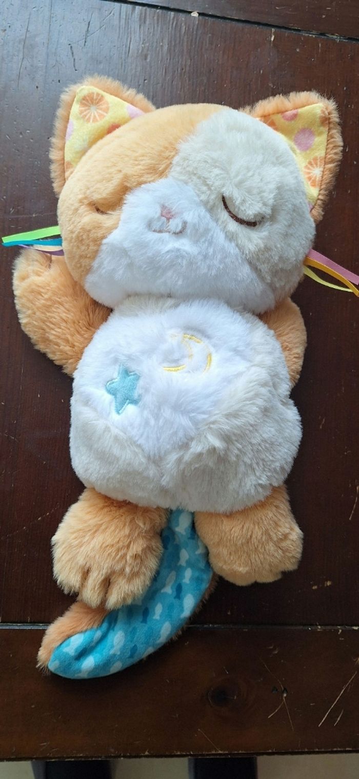 Comme neuf est rester dans un bac a peluche, une tache a l'interieur. Fonctionne parfaitement bien. Mon chaton douce nuit est la peluche, pour apporter tout le réconfort dont bébé a besoin au moment de l'endormissement. Le ventre de la peluche se soulève et s’abaisse en rythme pour reproduire les mouvements de respiration et ainsi calmer bébé naturellement. Le chaton ronronne, sa tête et son museau s'animent en même temps pour apaiser bébé. Mon chaton douce nuit diffuse jusqu’à 45 minutes de musiques douces, de sons de la nature et de lumières apaisantes Elle possède aussi un bouton Etoile pour choisir entre 15, 30 ou 45 minutes de mélodies et de sons apaisants.