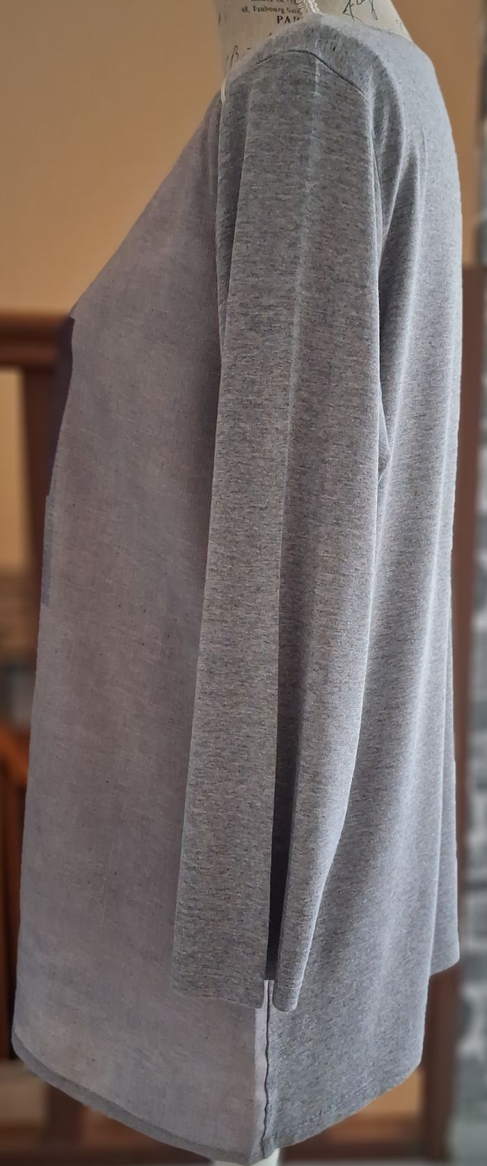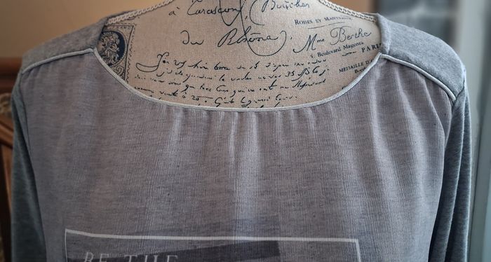 Pull fin en polyester, viscose, acrylique et élasthanne. Les manches sont 3/4. Le devant est imprimé et légèrement transparent. Le col a un liseré argenté. Des petits fils sont tirés mais ça se voit à peine.