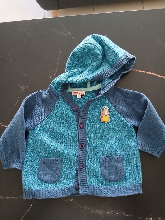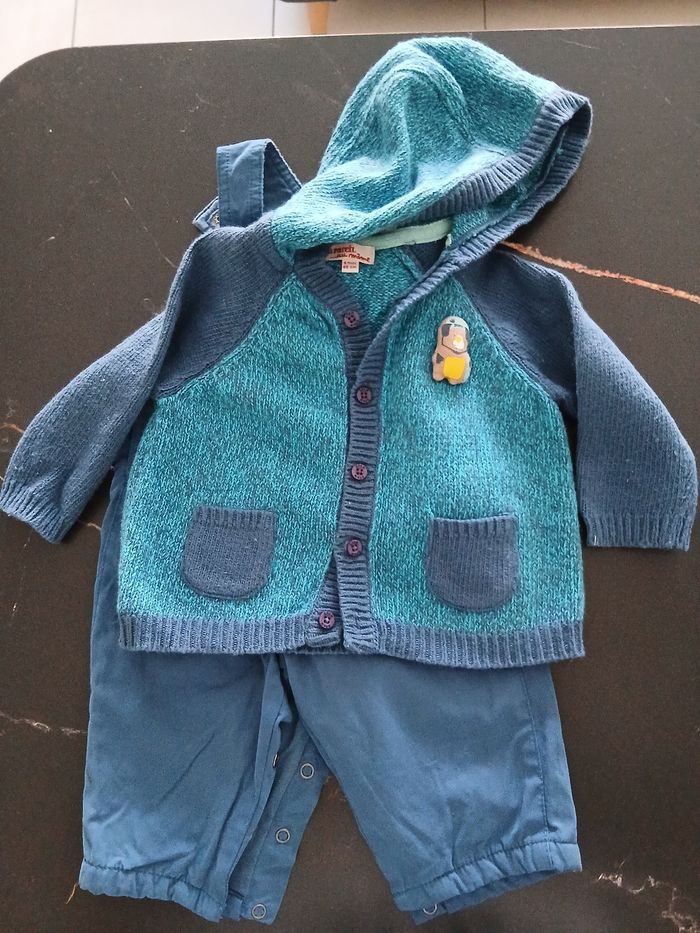 Salopette doublée avec boutons pressions entre jambes, tee shirt ML et gilet en laine
