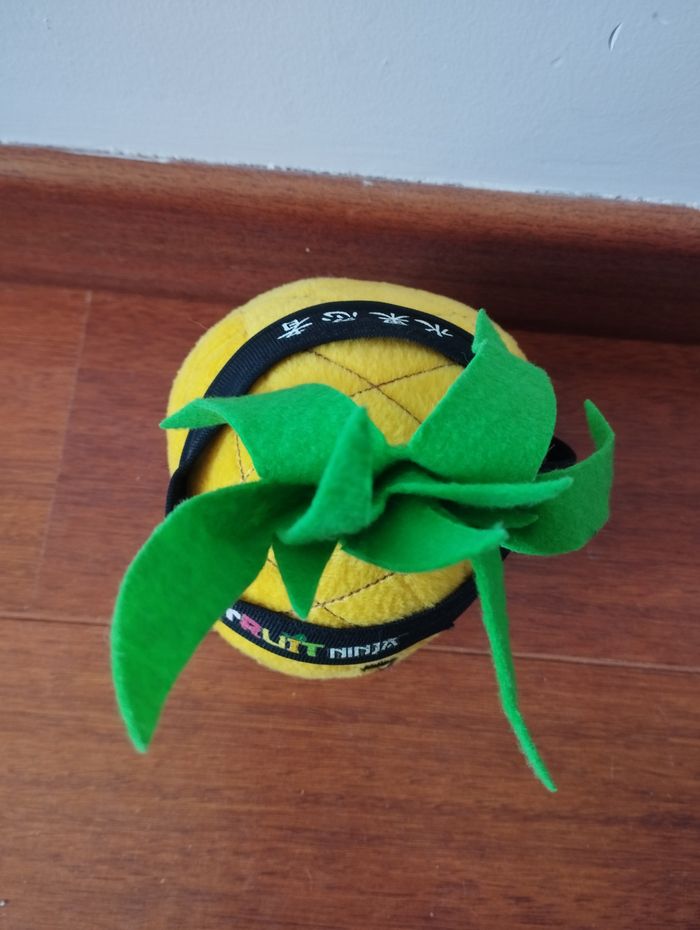 Peluche Ananas. Elle mesure environ 15 cm par 12 cm (sans tenir compte des feuilles vertes). Hormis l'écriture un peu abîmée et les feuilles tombantes avec une qui est légèrement coupée, elle est en très bon état.