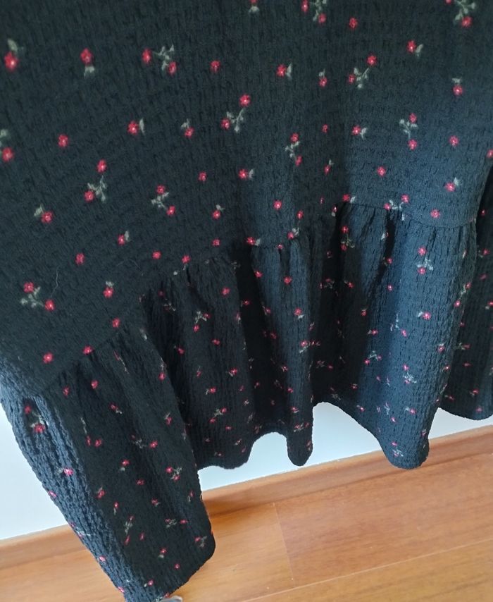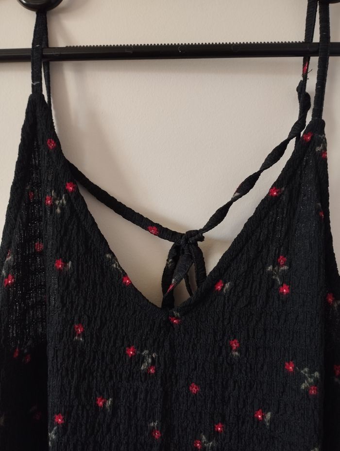 Robe longue femme de la marque Kiabi. C'est une taille S. Elle est noire avec des petites fleurs rouges. Il y a un volant sur le bas. Elle a une matière crépée. Elle a de fines bretelles réglables. Je n'ai pas d'infos sur la composition car l'étiquette a été coupée. Elle est neuve sans étiquette car jamais portée.