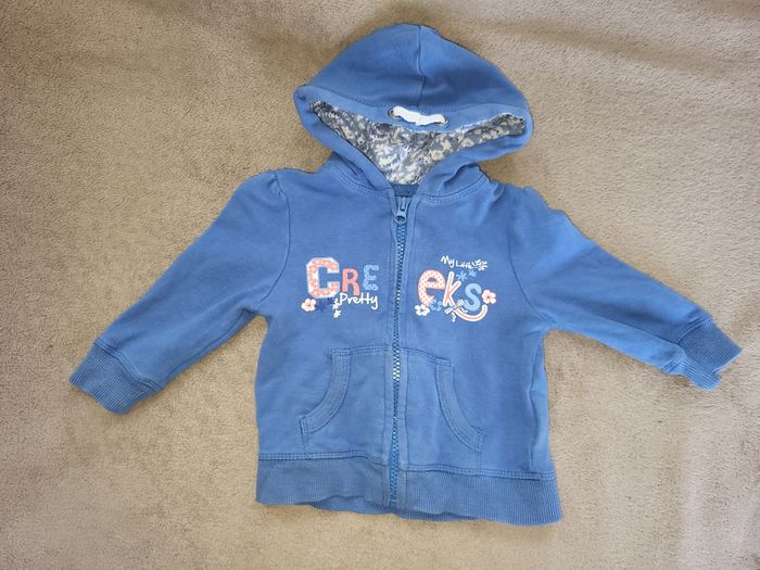 Lot de 2 Sweats à capuche zippé - rose clair tape à l'œil broderie ailes dans le dos - bleu creeks motif fleurs Tous les 2 ont été bien portés #virgy61fille12mois