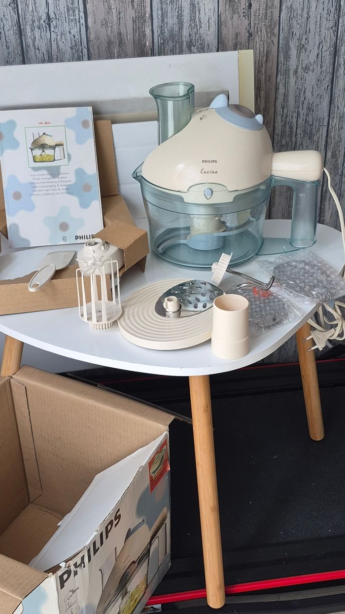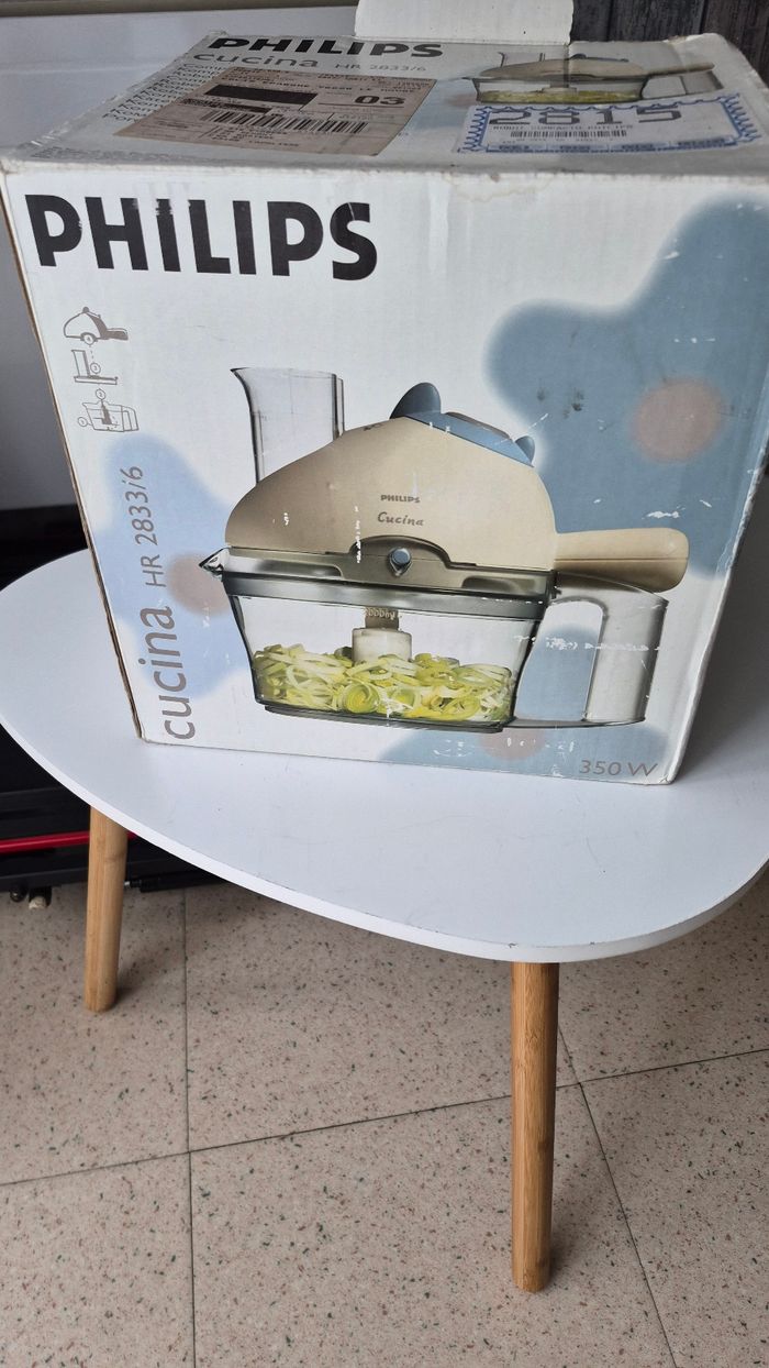 Robot multifonction Philips Cucina HR2833/6 – 350W ✨ Robot de cuisine complet et polyvalent, idéal pour hacher, râper, mixer et préparer facilement toutes sortes de recettes au quotidien. ✔️ État : neuf ✔️ Marque : Philips ✔️ Modèle : Cucina HR2833/6 ✔️ Puissance : 350W ✔️ Bol grande capacité (environ 2,2 L) ✔️ Plusieurs accessoires inclus : lames, disques de découpe, fouet, etc. ✔️ Vitesse réglable + fonction pulse ✔️ Utilisation simple et rapide 📦 Livré avec sa boîte d’origine et notice Parfait pour gagner du temps en cuisine avec un appareil complet et fiable 🍴
