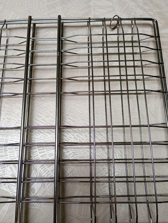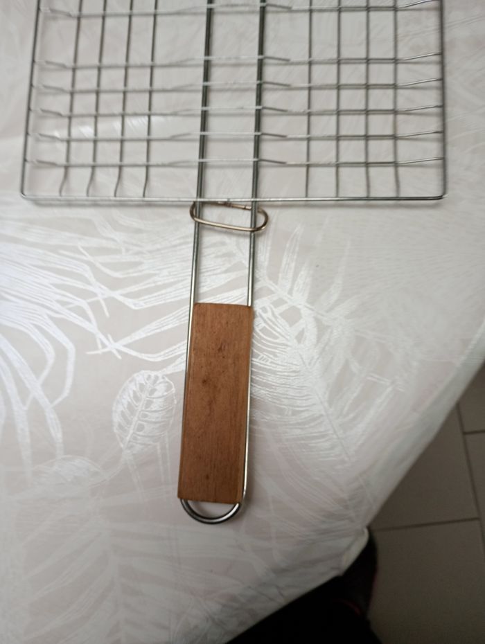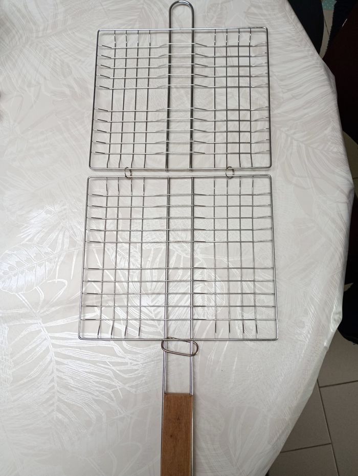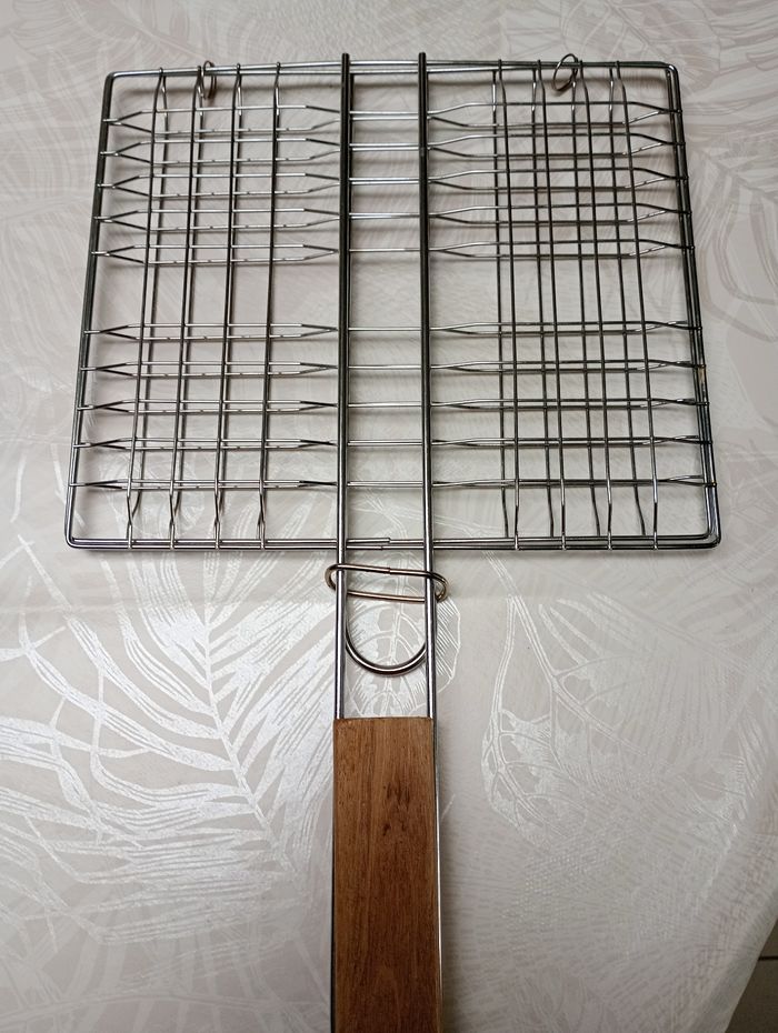 Grille de cuisson double pour barbecue, idéale pour griller des poissons, des légumes ou des aliments fragiles sans qu'ils ne tombent dans les braises. Un anneau coulissant sur le manche permet de verrouiller les deux grilles ensemble. Grille en inox et manche en bois. Dimensions grille : 20 x 23 cm. Très bon état.