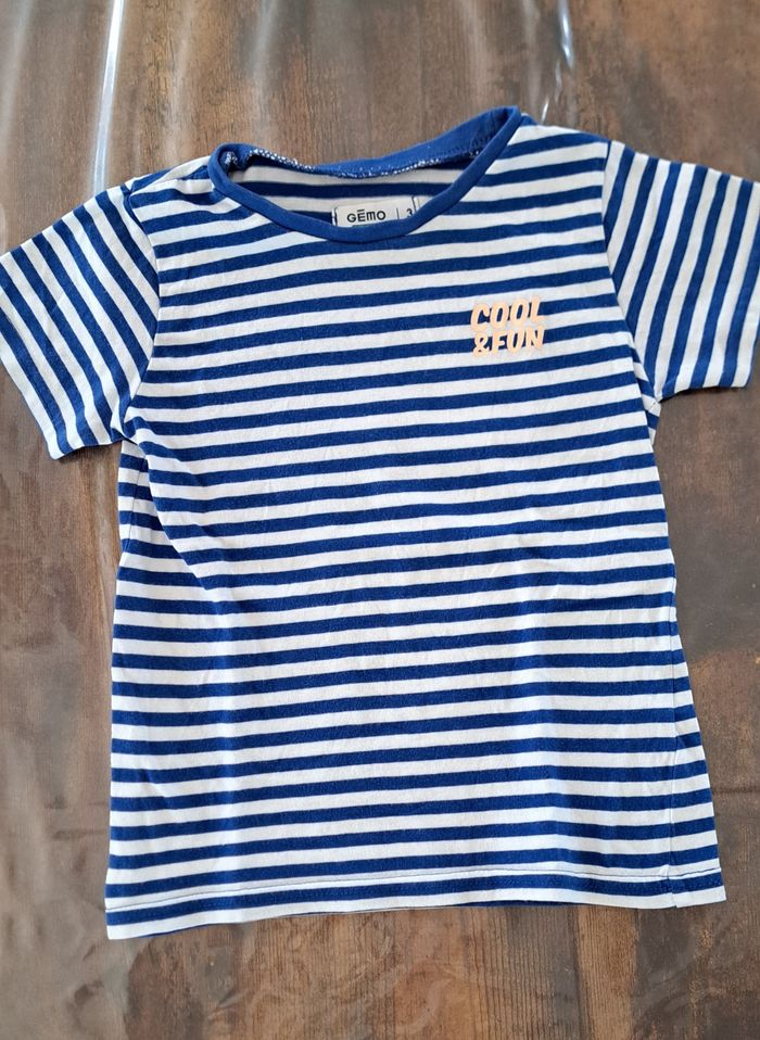Tee shirt rayé, bleu et blanc Marque gémo Taille 3 ans Petite écriture sur la poitrine, côté cœur. Col rond En parfait état