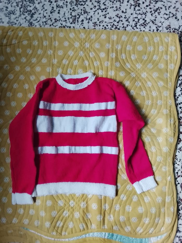 Bonjour, tricote main,très beau pull en rouge et blanc a manches longues. 100% Acrylique. Au point jersey. En très bon état et couture impeccable.