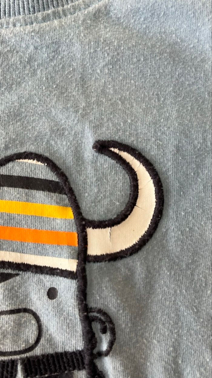 Pyjama pirate taille 2 ans Bien porté il est bouloché, le dessin un peu abîmé et la couleur est un peu passé d’où le prix