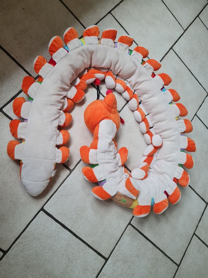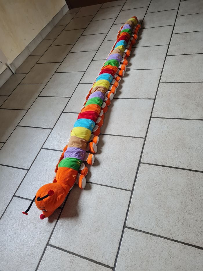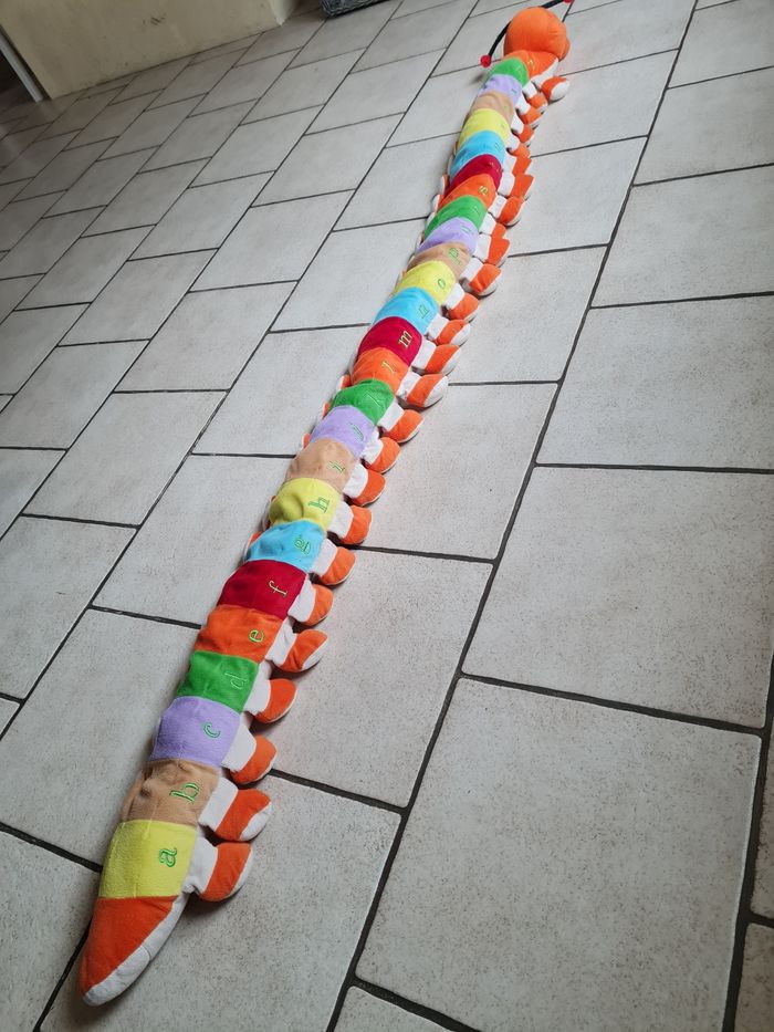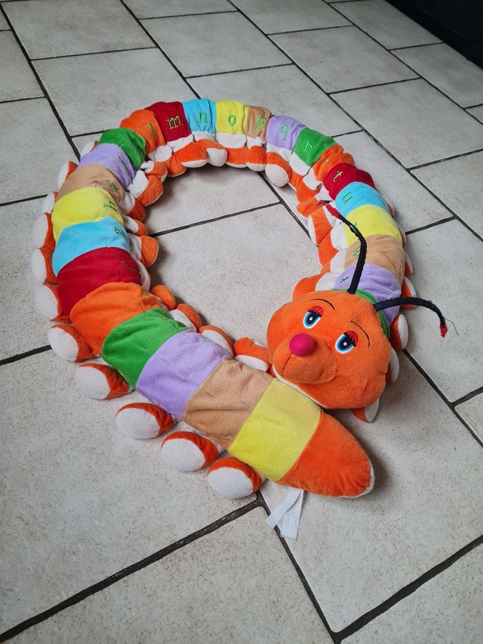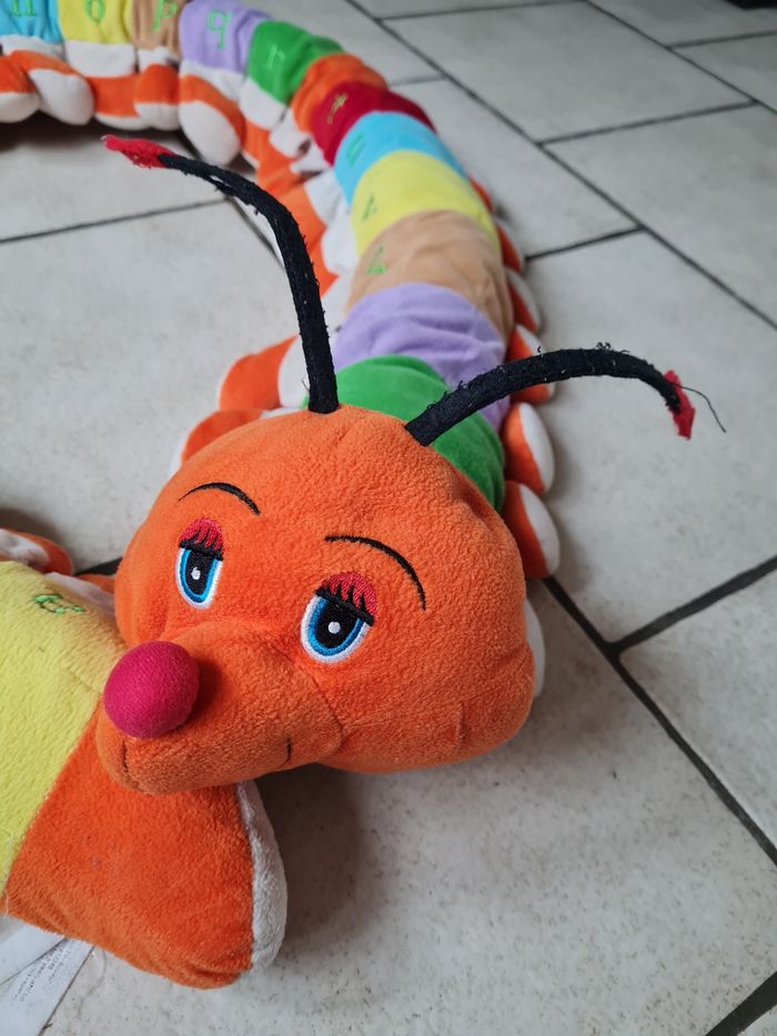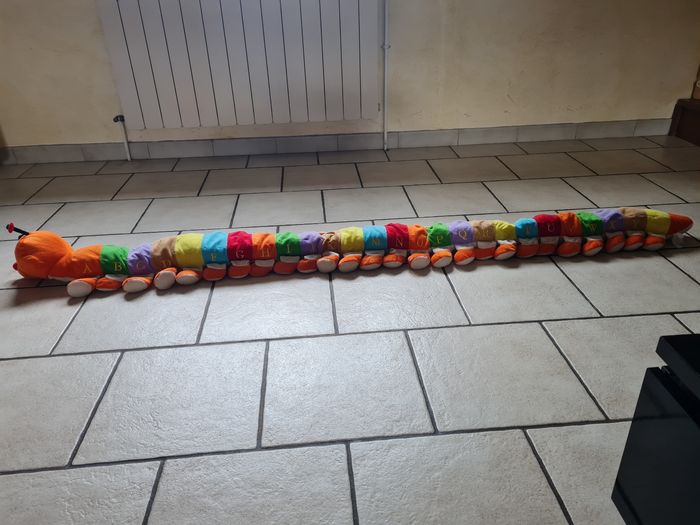 Grande chenille ABCD en très bon état Juste un peu décousue sur les antennes. 1 côté avec écriture alphabet en minuscule 1 côté avec écriture alphabet en majuscule