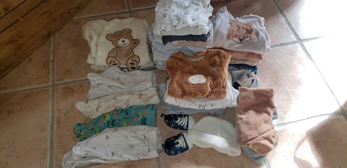 Lot vêtements bébé taille naissance 1 mois très bon état certains vêtements sont neuf jamais porté pyjamas bodies 2 combinaisons pantalons brassière 1 paire de chaussures 1 bonnet je donne quelques paires de chaussettes avec