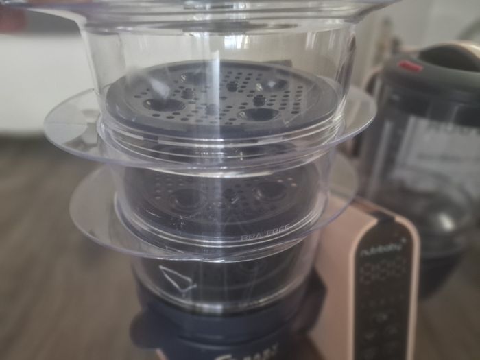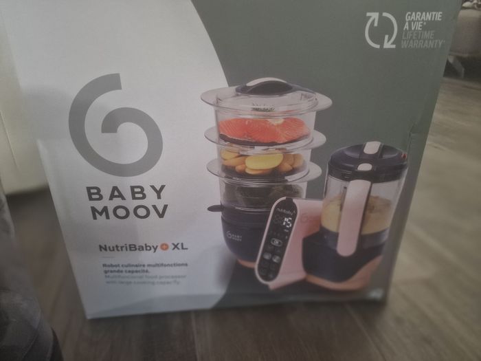 Robot nutribaby Xl de Babymoov très peu utilisé. 1 côté cuit vapeur sur 3 niveaux empilables, hauteur des etages modulable. 1 cote mixeur, avec plusieurs types de mixage selon le type de purée (ou autre) que vous souhaitez, très lisse, moins lisse.. Magnifique coloris bleu nuit et cuivre Quelques traces sur les bols de cuisson liés à la vapeur