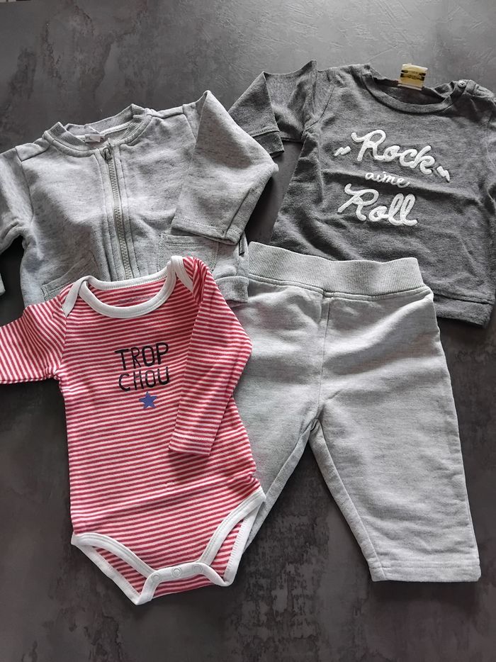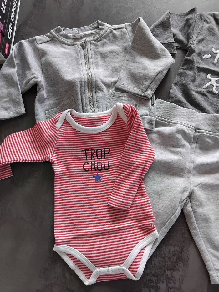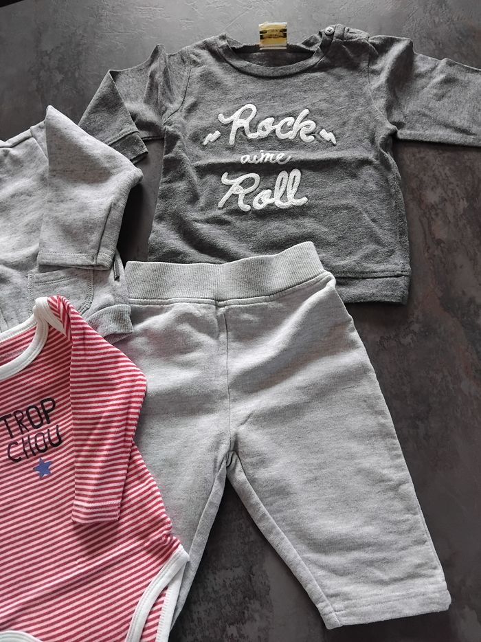 Lot 1 bodies manches longues. 1 gilet, 1 pull fin et 1 pantalon. Taille 9 mois