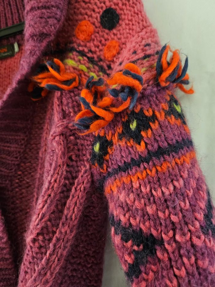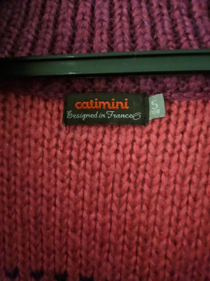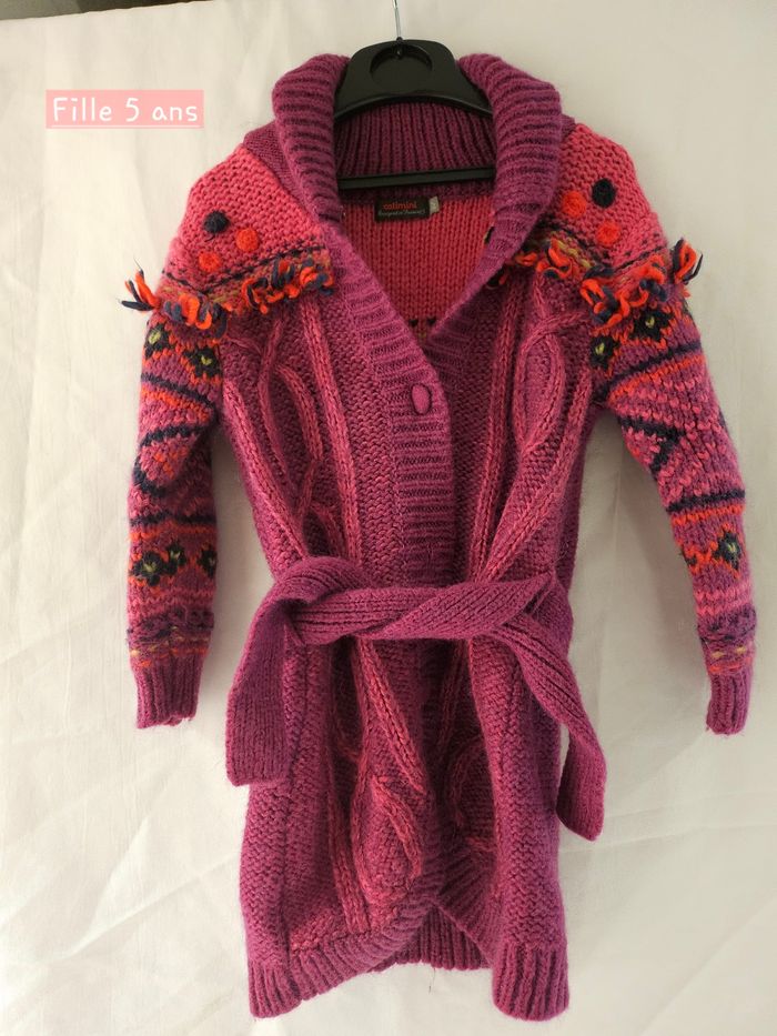 Gilet long manches longues. Se ferme avec boutons et une pression. Ceinture à nouer amovible. Violet, rose majoritaire. Marque : Catimini Taille : 5 ans