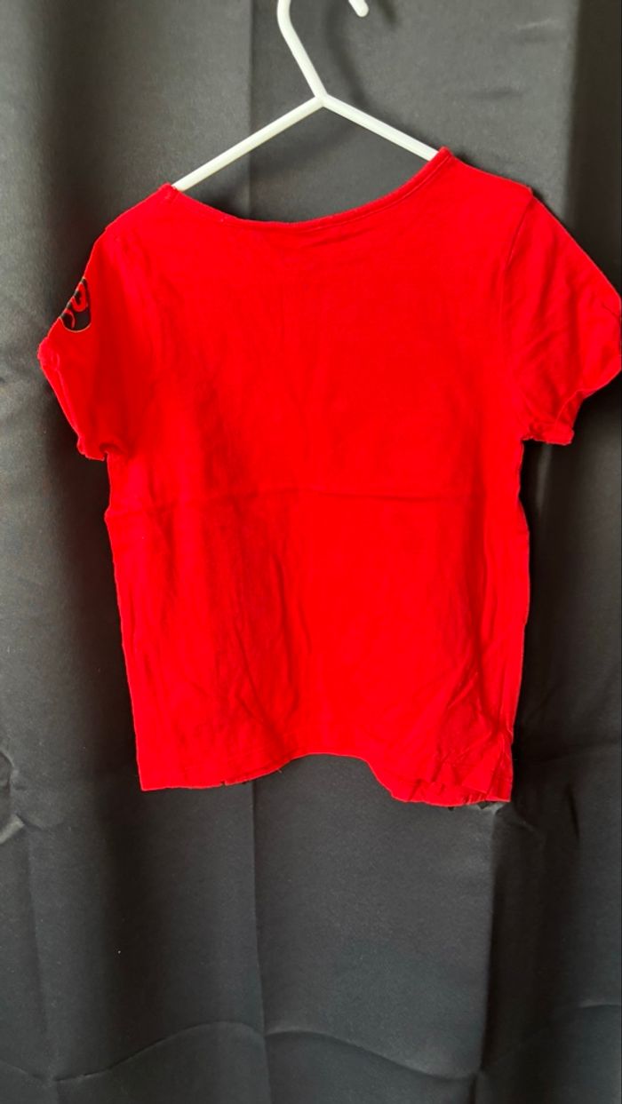 T-shirt rouge Mirabelle à l’effigie de Ladybug, taille 8 ans. Il est décoré d’un imprimé doré et coloré représentant Ladybug et Chat Noir, avec l’inscription "Ladybug in Shanghai".