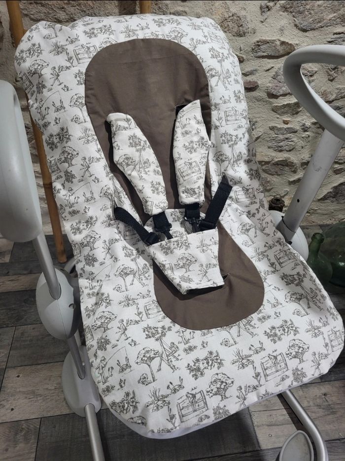 Housse qui s'ajoute à l'assise d'origine du transat up and down de béaba . Imprimé toile de jouy/ taupe Accessoires sangles et entre jambe assortis. Lavable en machine à 30° Page fb Zol&Saan confections Insta zolsaan Site internet Zolsaanconfections.com