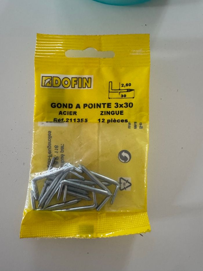 pointe de la marque Dofin, parfaits pour vos travaux de fixation et d'assemblage. Ces petits éléments de quincaillerie sont essentiels pour tout bricoleur. - Type de produit : Gond à pointe - Marque : Dofin - Dimensions : 3 x 30 mm - Matière : Acier zingué - Quantité : 12 pièces - Référence : 211355