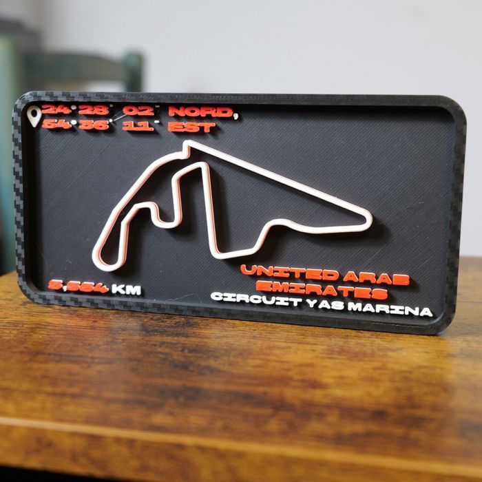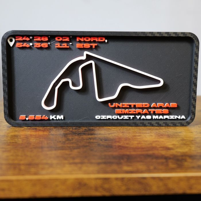 Cadre Du célèbre circuit d’Abou Dhabi YAS MARINA Contours effet carbon Dimensions : 150mm x 70 mm Couleur : Noir , blanc , rouge Idéal pour cadeau ou fan de F1 Envoie rapide Mots clés : Cadeau , idée , anniversaires, décoration , cadre , mural , tableau , circuit , voiture , sport