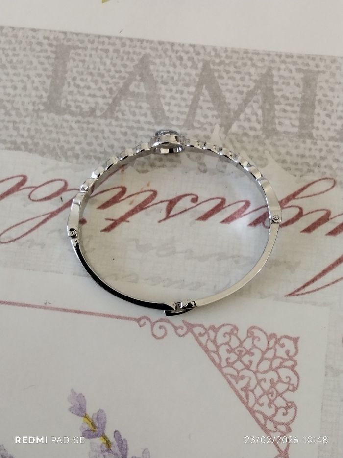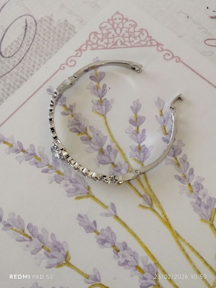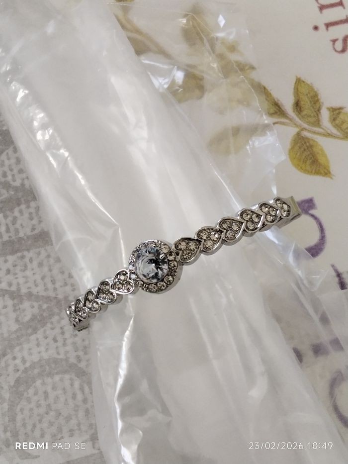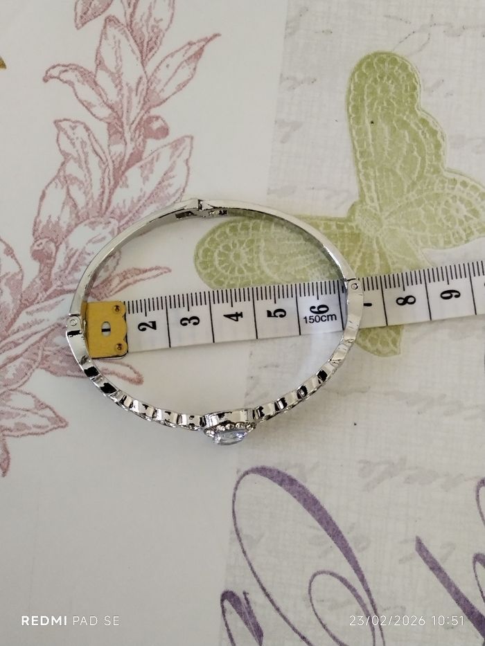 Je mets en vente un bracelet neuf original. Il n'a pas été mis. Il est de couleur argentée avec des strass. Je l'ai acheté sur un coup de tête "achat compulsif". J'ai mis en photo, le diamètre de celui-ci.