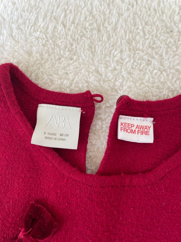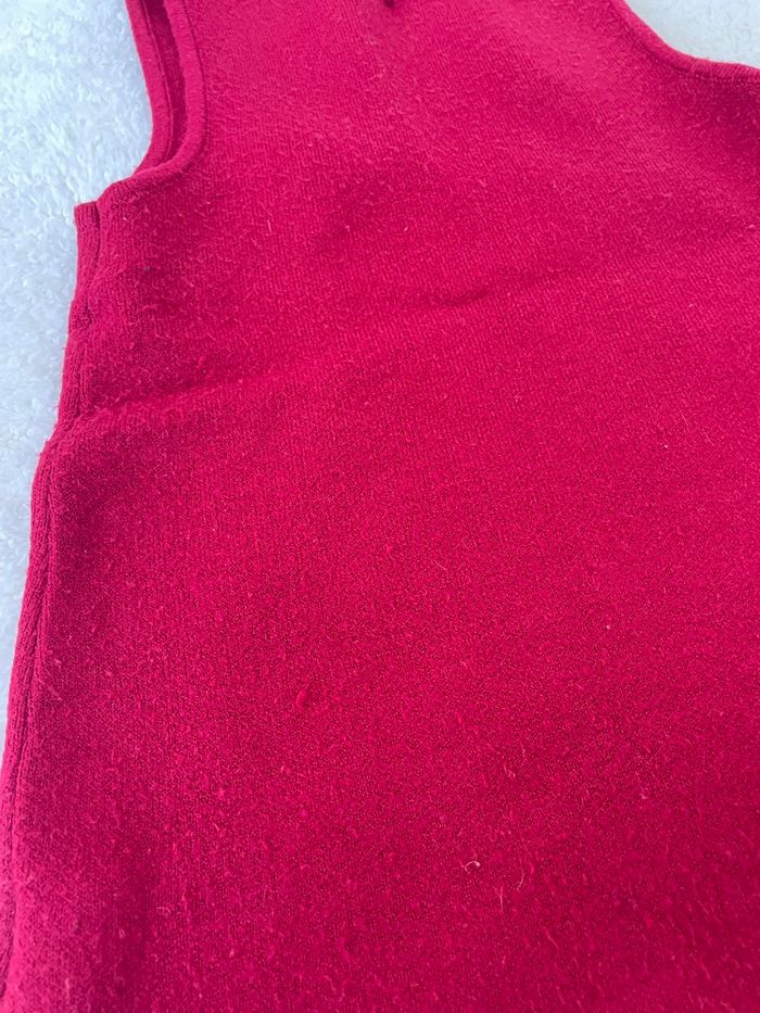 Robe rouge avec des noeuds. Petites bouloches sur l’arrière de la robe