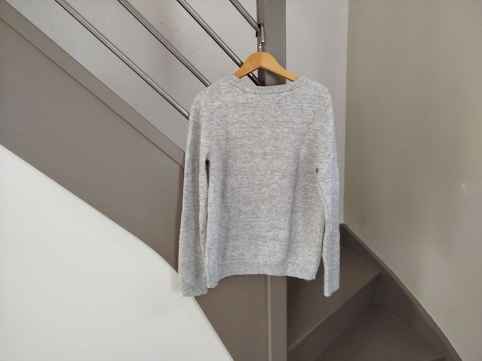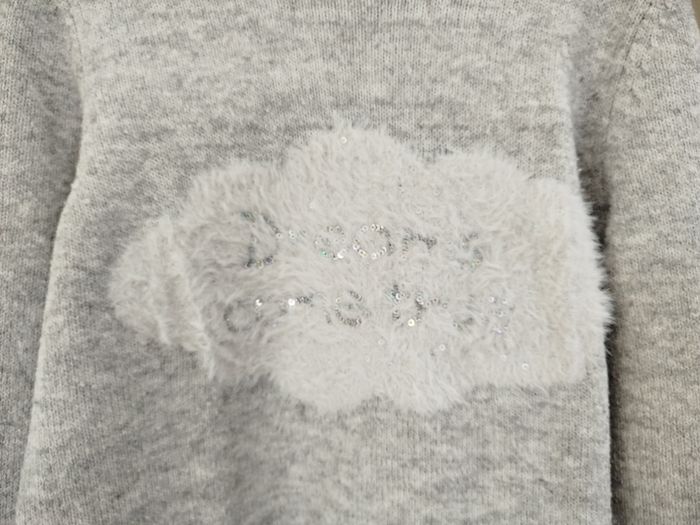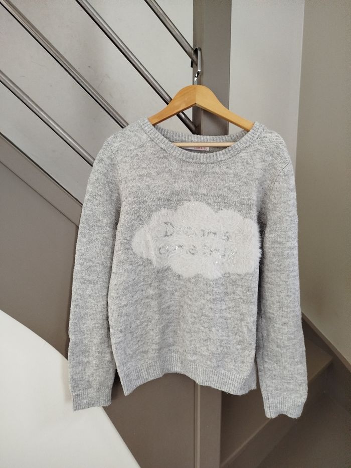 Pull gris à col rond, illustration "Dreams come true" en sequins argentés dans un nuage blanc. Marque Camaïeu, taille S. Réduction activée sur les lots. #femme #pull #camaieu #tailles #taille36