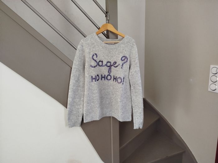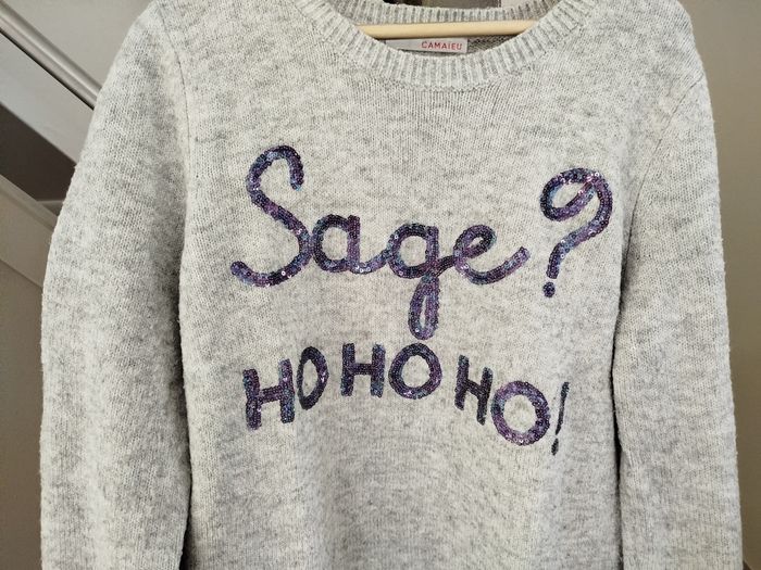 Pull gris à col rond, inscription "Sage ? Ho Ho Ho !" en sequins violets brillants. Marque Camaïeu, taille S. Réduction activée sur les lots. #femme #pull #camaieu #tailles #taille36