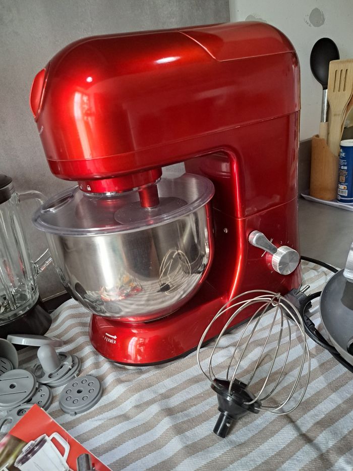 Robot complet avec manuel d'utilisation. Manque juste le petit cache sur le dessus du couvercle du mixeur. Multifonction vous pouvez tous faire avec ! De vos gâteaux, aux saucisses haché maison ! Très bon état n'est pas abîmé et fonctionne parfaitement ! Quelque accessoire sont ternie par le lave vaisselle. Sera envoyé soigneusement avec vidéo pour prouver qu'il fonctionne.