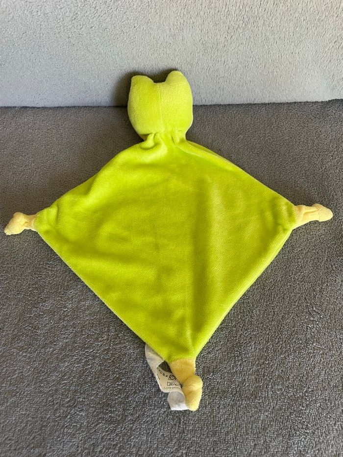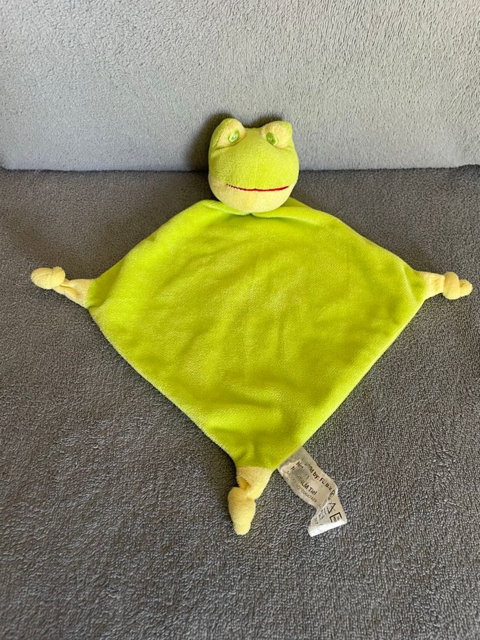 Doudou plat grenouille vert Aux extrémités 3 noeuds jaune +/- 30cm FL HET EEK Occasion en très bon état Vous achetez le doudou que vous voyez sur la photo