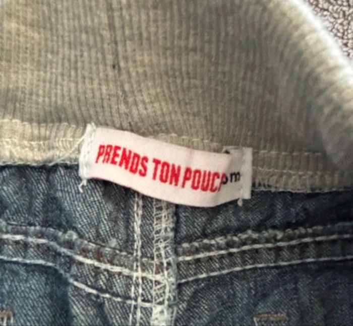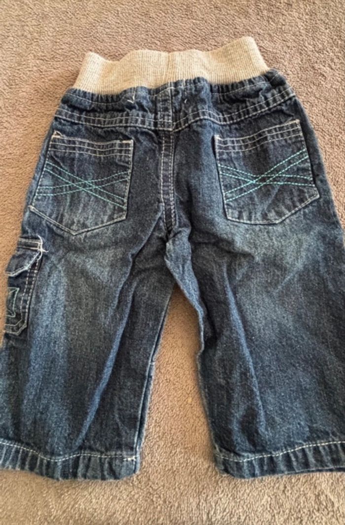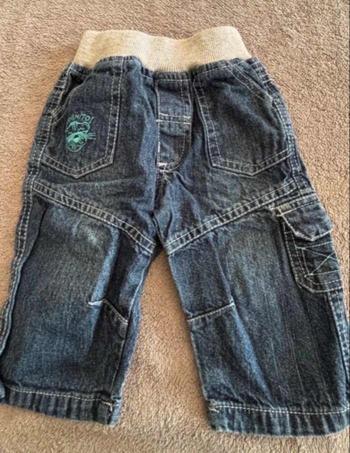 Joli pantalon bébé taille 6 mois, couleur jean bleu. Modèle confortable avec large taille élastique en bord‑côte beige, facile à enfiler. Détails pratiques et mignons : poches arrière avec surpiqûres décoratives et poche latérale sur la jambe. En très bon état, parfait pour un look décontracté. ✔️ Confortable et pratique ✔️ Style casual adorable
