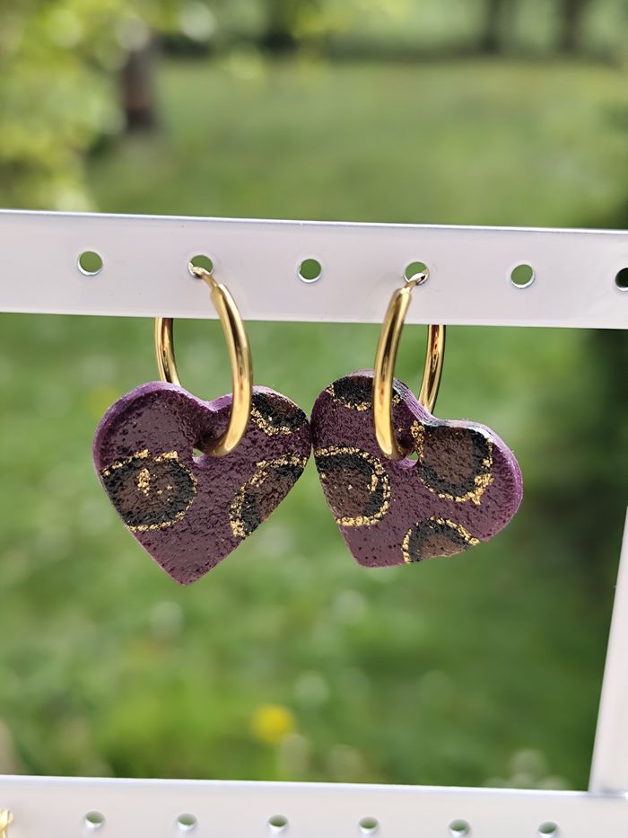 Créoles avec pampilles Cœur Léopard violet Créoles inoxydable pampilles en pâte polymère fait main et neuf