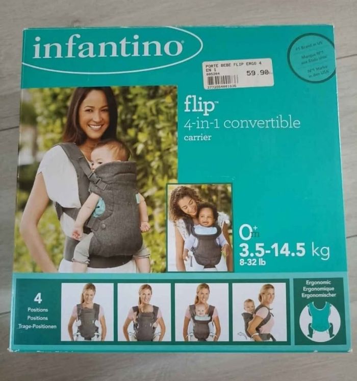 Porte bébé 4 positions 0 mois et + de 3,5 à 14,5 kg, ergonomique. Neuf utilisé juste 2 fois lavé et remis dans son carton.